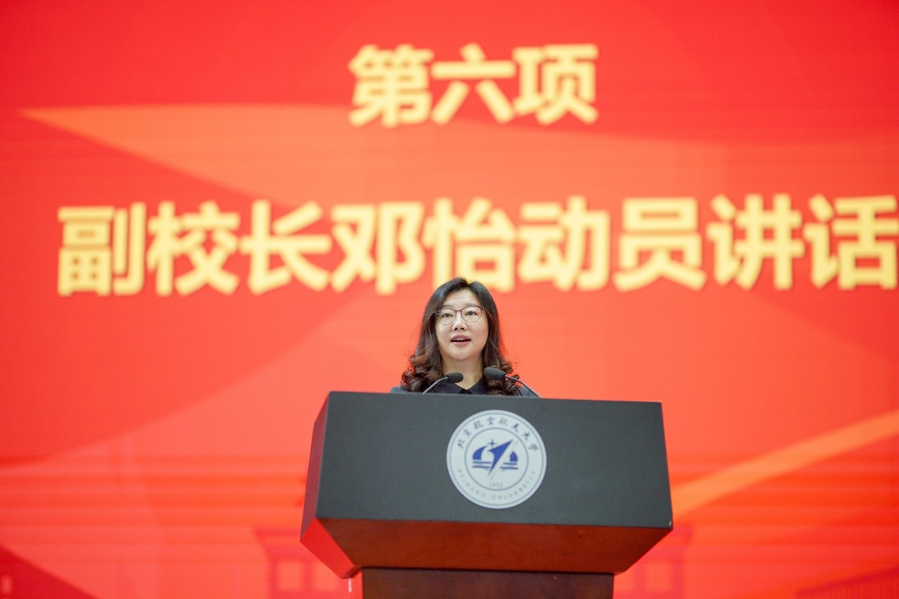 邓怡进行动员讲话。她回顾北航作为新中国第一所航空航天高等学府的使命担当,强调学校始终以“空天报国、敢为人先”为精神底蕴,传承红色基因,把服务国家作为最高追求。她指出今年是中国人民抗日战争暨世界反法西斯战争胜利80周年,同学们要铭记历史,接续传承“爱祖国、爱国防、爱航空、爱航天、爱北航”的“五爱”精神。邓怡对全体参训学员提出三点期望:一是以家国情怀涵养理想信念,将军训中的爱国热情转化为行动,传承北航精神;二是以坚韧品格锤炼奋斗底色,在磨砺中实现身心蜕变,永葆“越是艰险越向前”的奋斗姿态;三是以铁的纪律铸就钢的意志,将规则意识内化为未来科研学习的工匠态度。她希望同学们上好军训这堂大学“必修课”,完成身份转变与意志升华,深刻领悟新时代北航学子的责任担当。