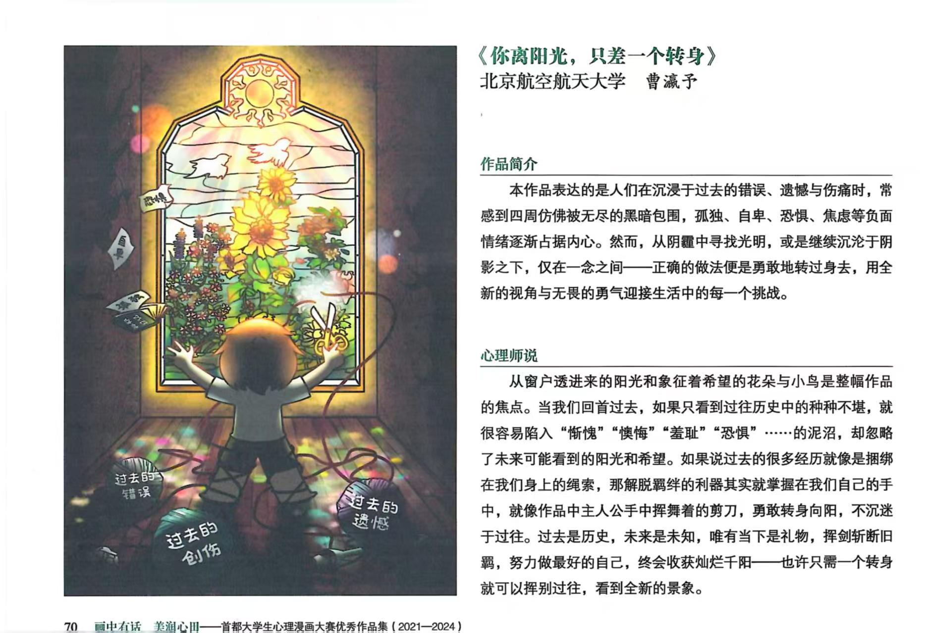 学校结合当代大学生思想心理特点,聚焦培养学生积极心理品质,以大学生心理健康季为基础,在全校范围组织了10项活动,活动内容丰富、形式多样,参与学生6100余人。其中,心理成长演讲比赛活动被中央广播电视总台社教中心全程直播,在线观看大学生超180万人次。曹瀛予等6位同学的漫画作品被收录进《画中有话,美润心田——首都大学生心理漫画大赛优秀作品集(2021—2024)》,将心理与艺术形式深度融合,帮助大学生在潜移默化中获得心理教育与自我成长。